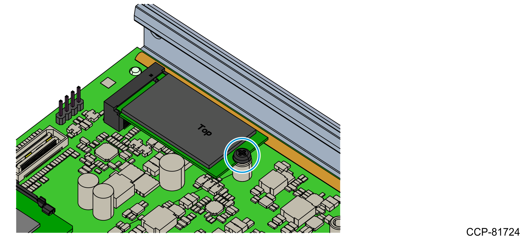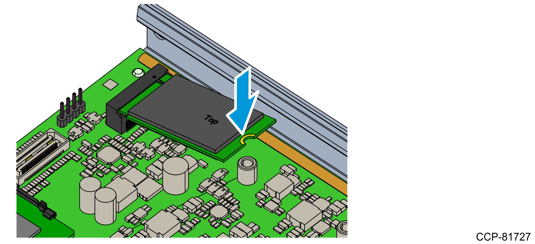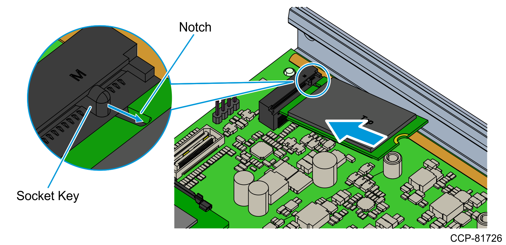 - Insert the Storage Module at an angle into its socket, aligning the notch on the Storage Module with the socket key.Caution