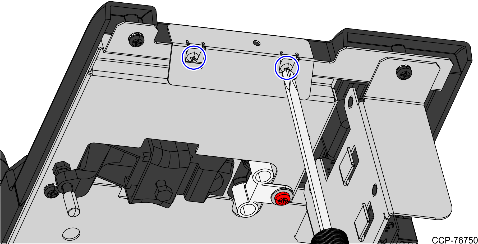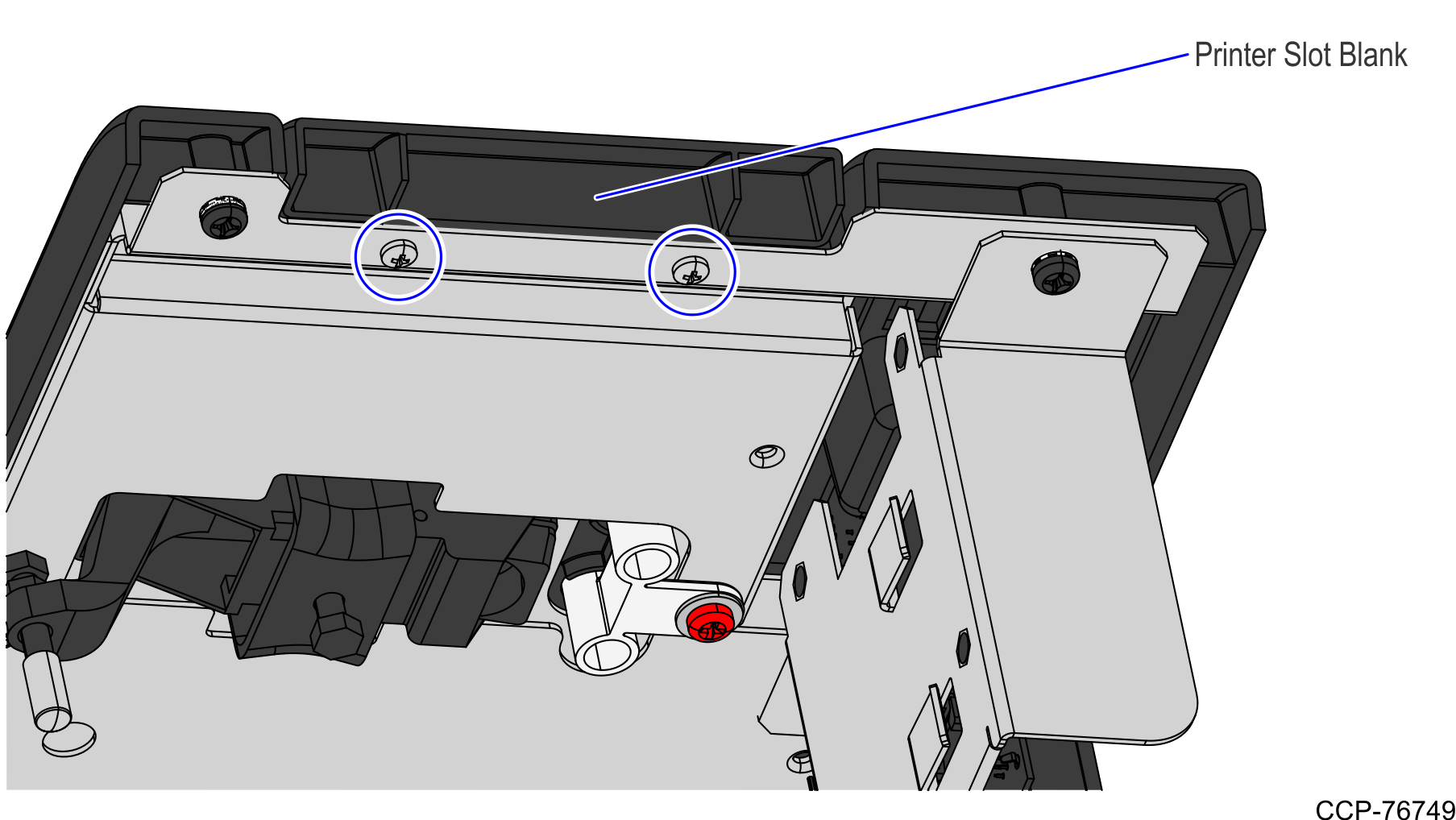 a.Remove the two (2) plastite screws, which secure the plastic printer slot blank on the metal door, as shown in the image below.