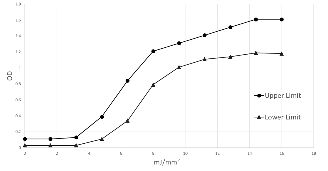 Energy to be equal or less than 11.2 mJ/mm2 at 1.1 OD Note: For more information, refer to the Dynamic Sensitivity Range graph below. |