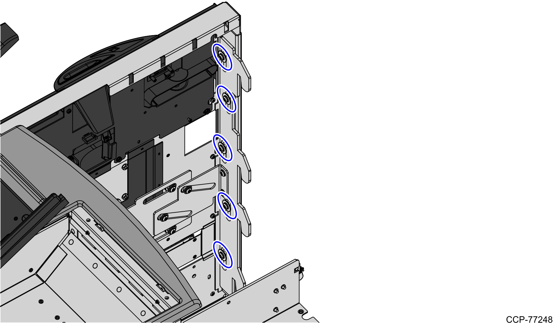 2.Secure the hook bracket to the Core Door using five (5) sets of hex drive screws, tooth washers and flat washers, as shown in the image below.
