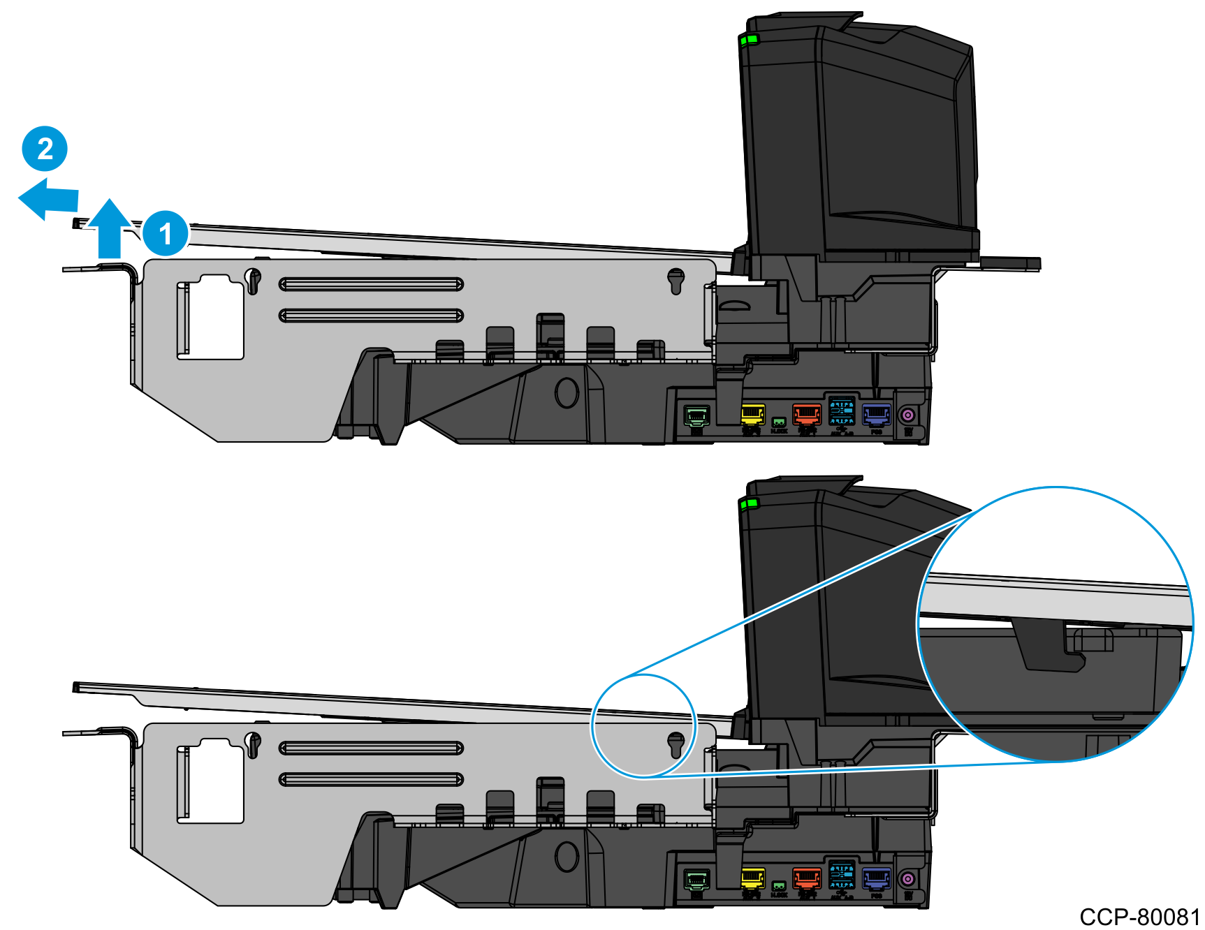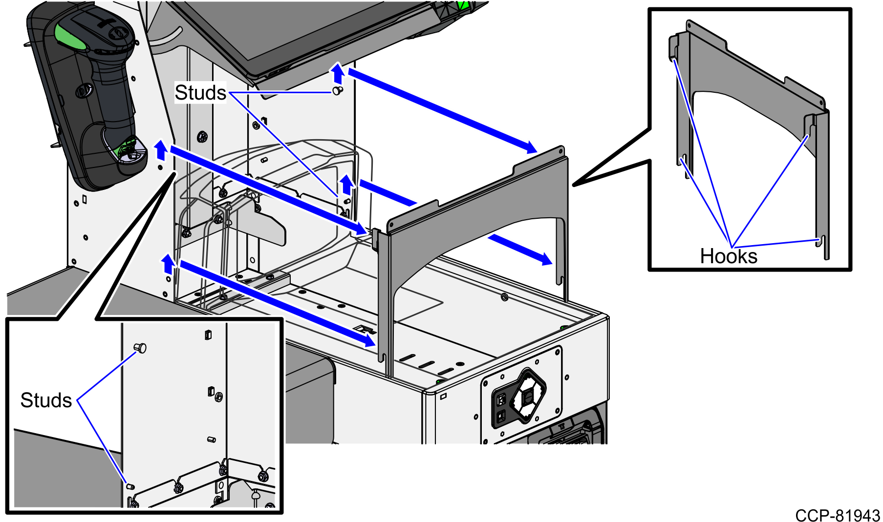- Lift the Scanner Shroud to unhook from four (4) studs on the Tower Cabinet, as shown in the image below.