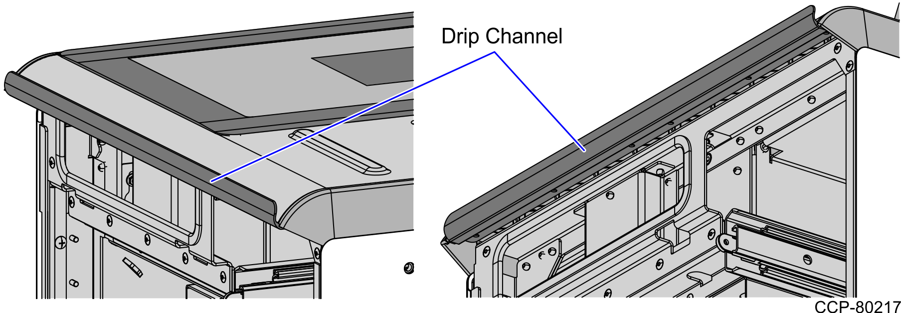 - Press the Drip Channel firmly on the SelfServ Checkout Top Plate edge. Ensure that there are no air bubbles.