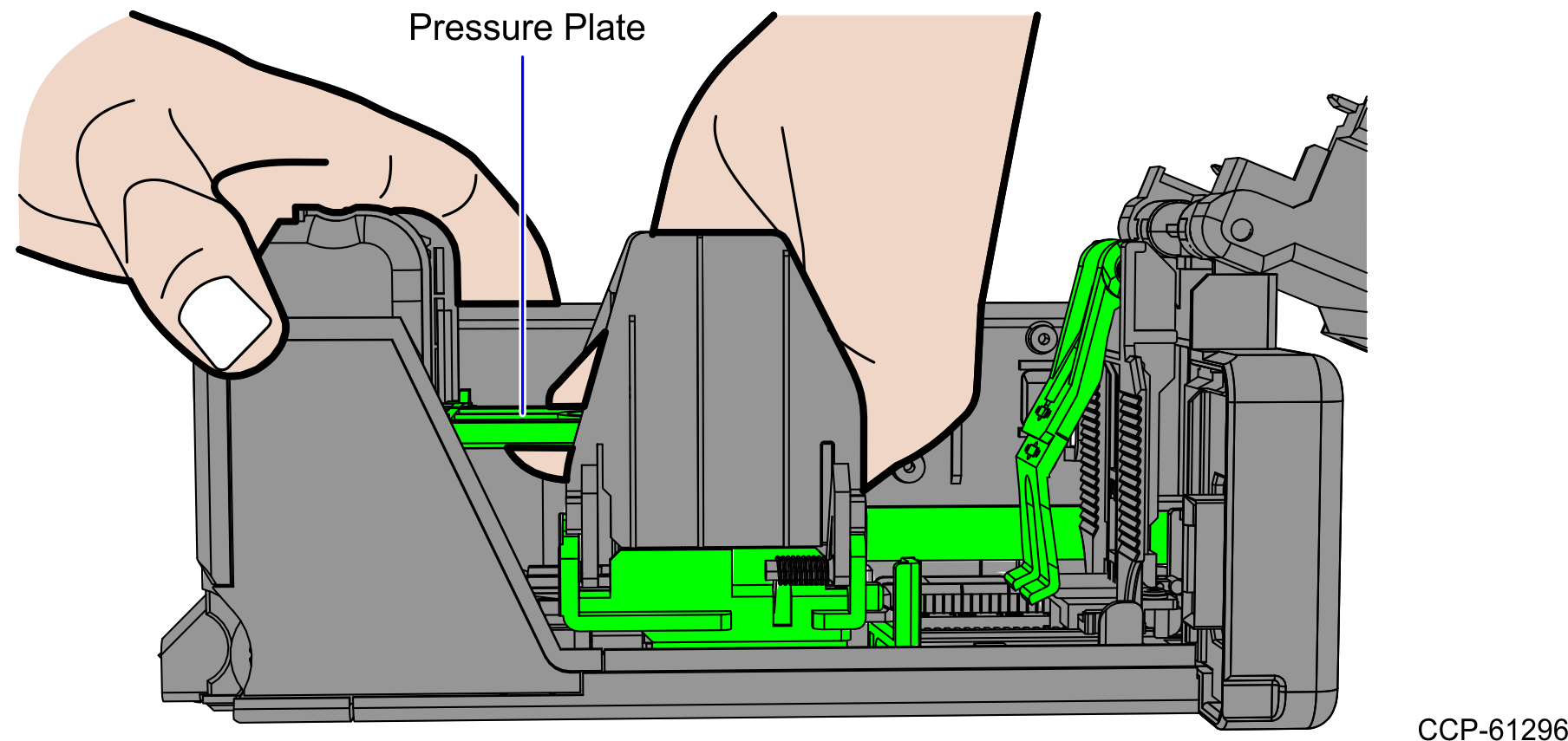 - Press the green button on the back of the Loader Cassette and open the cassette lid.