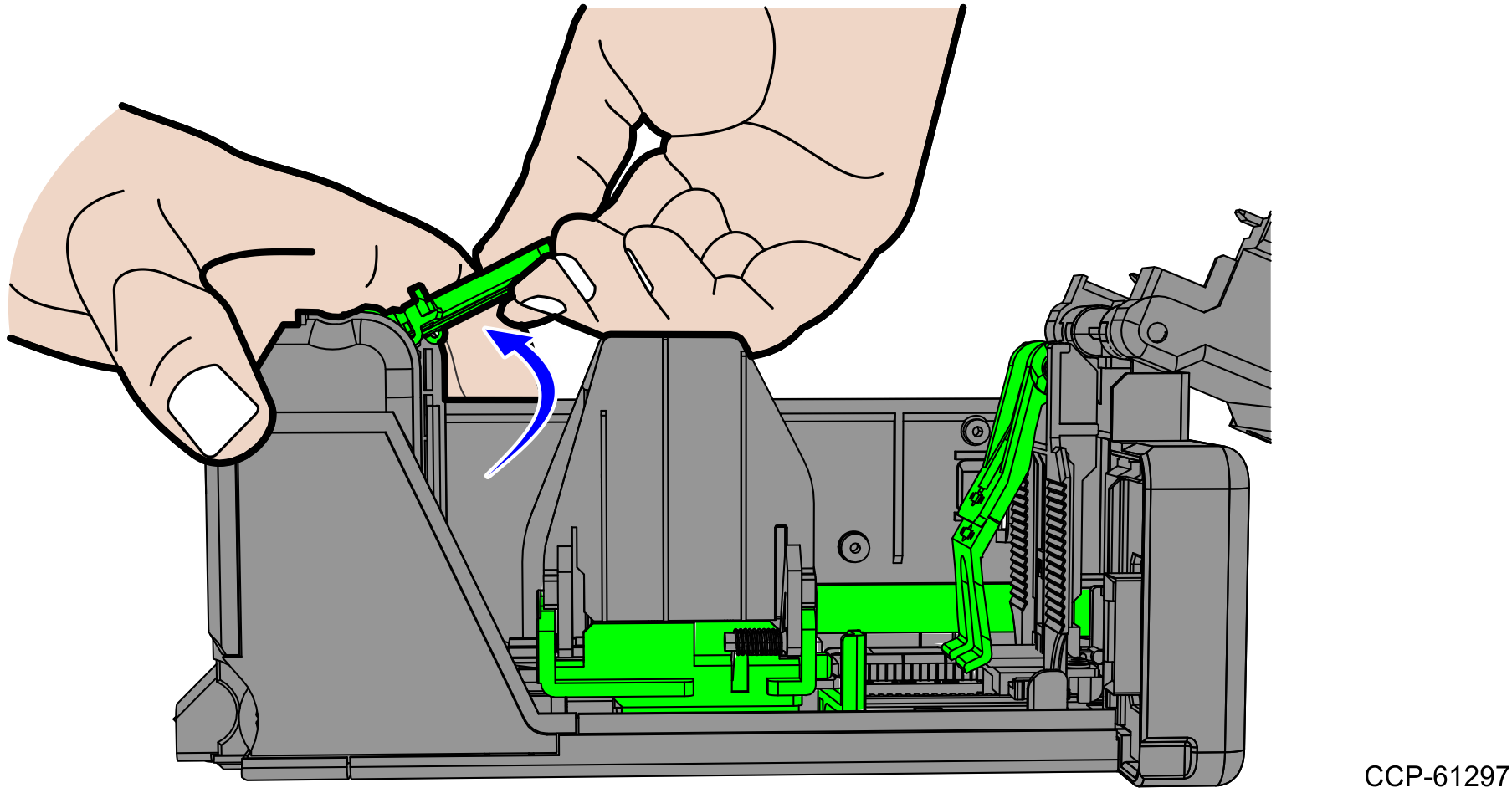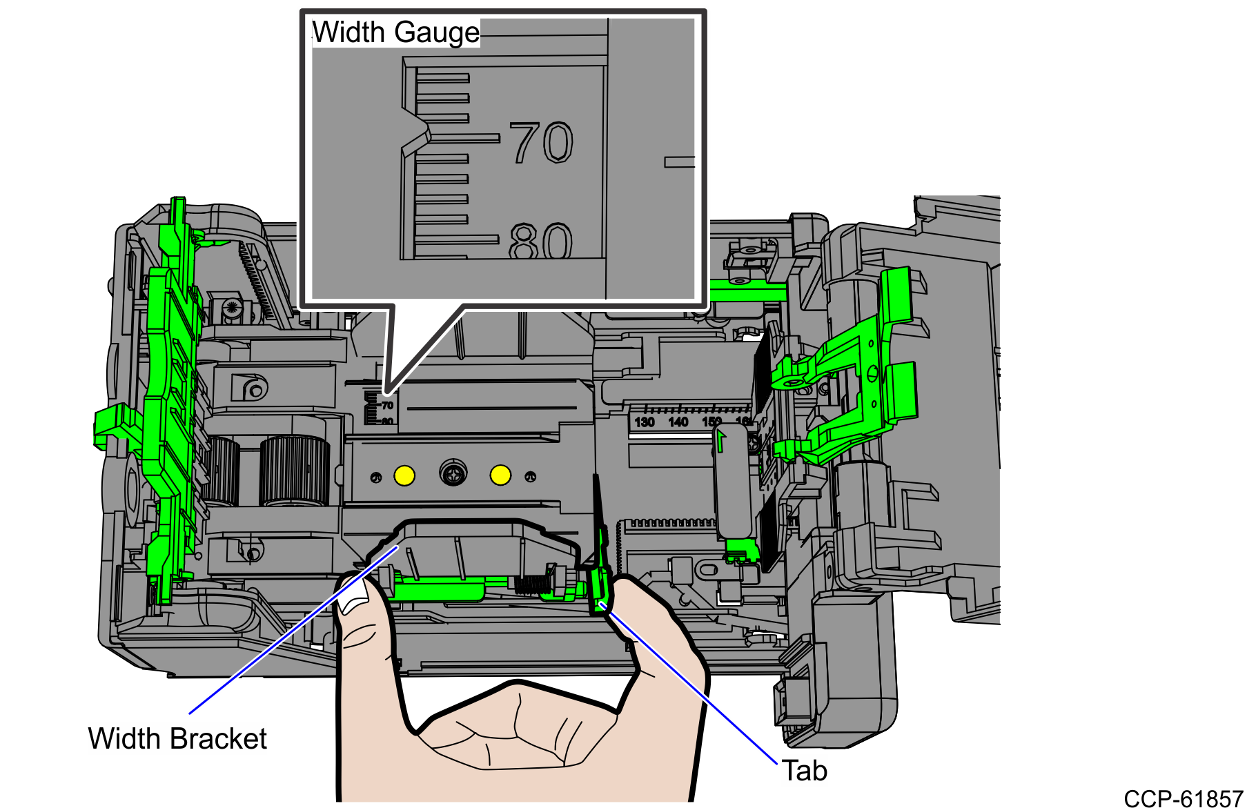 - Push the green tab on the width bracket and adjust the bracket so that the pointer on the gauge aligns with the width setting value for the corresponding note denomination.