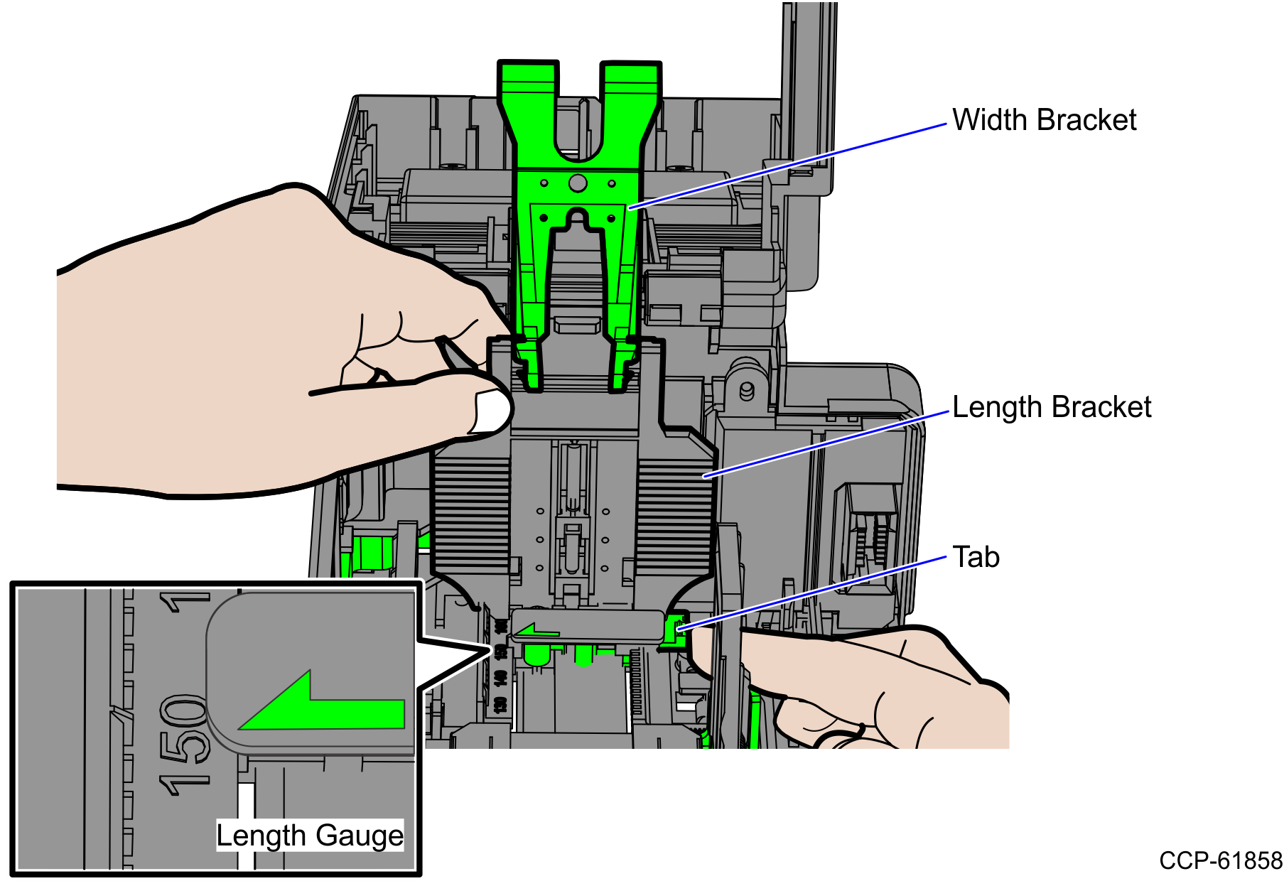 - Push the green tab on the right side of the length bracket and slide the bracket so that the pointer aligns with the length setting value for the corresponding note denomination.