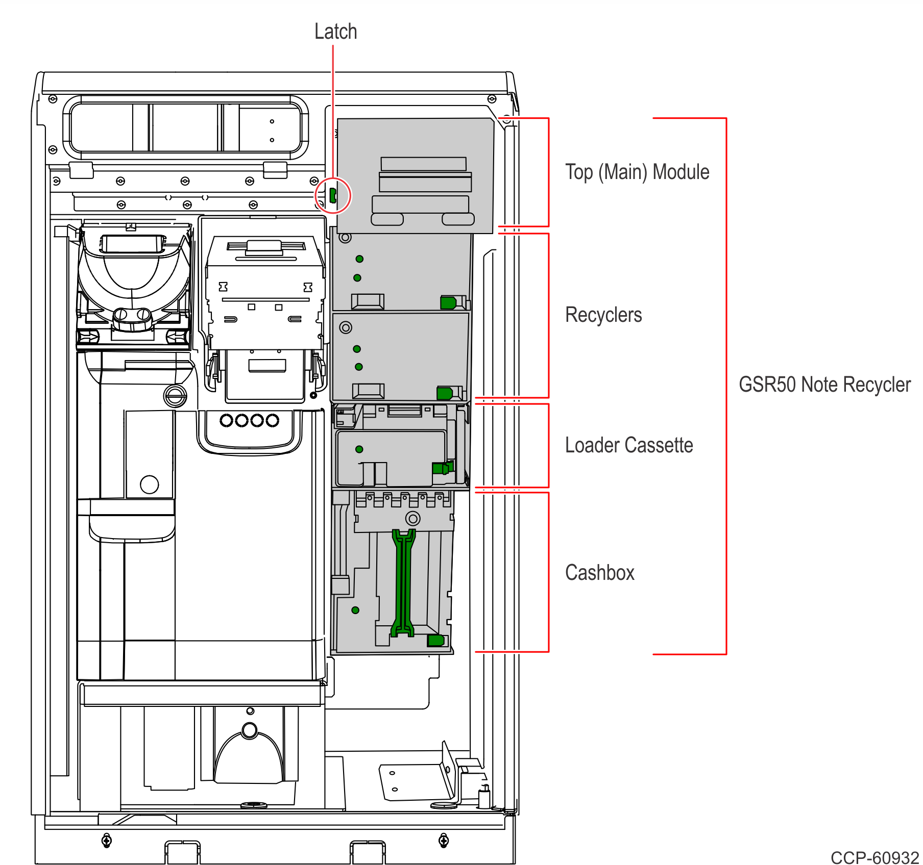 - Pull the green latch toward the Top (Main) Module, and then rack out the GSR50 Note Recycler out of the cabinet.