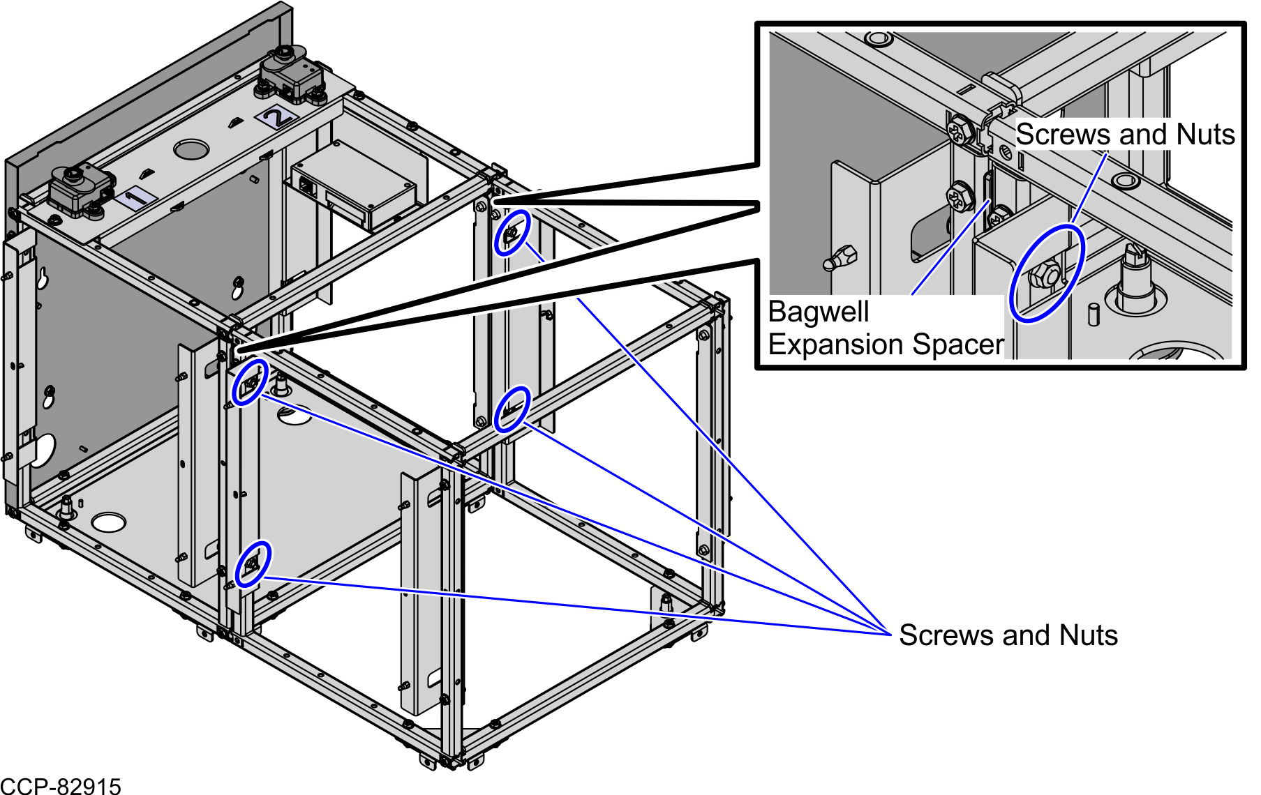 - Secure each Bagwell junction with the Spacers in between using four (4) screws and nuts, as shown in the image below.