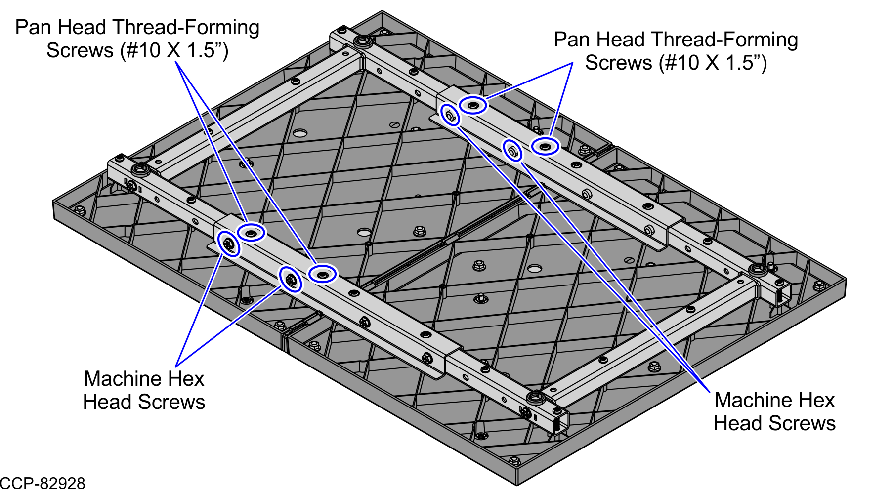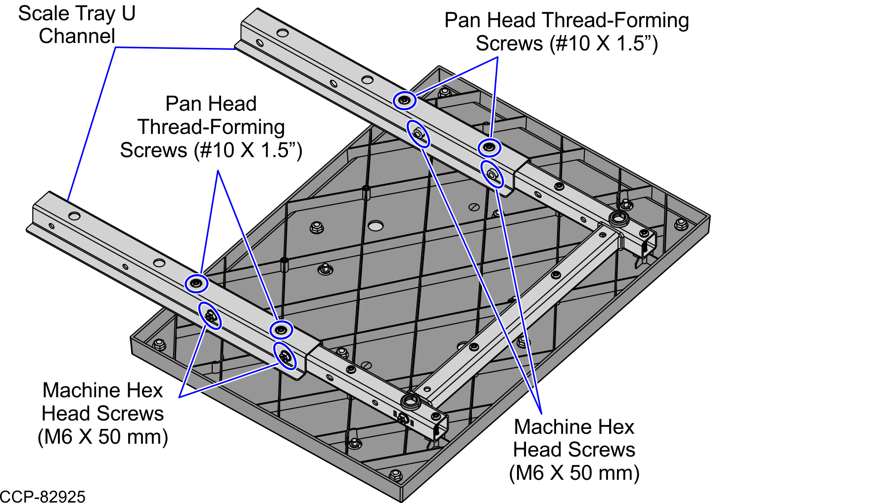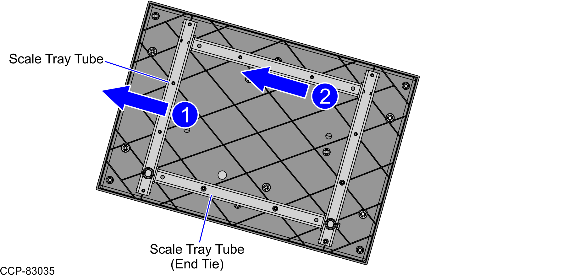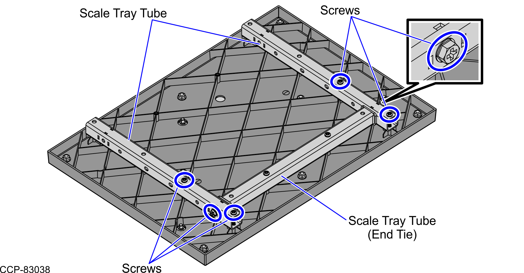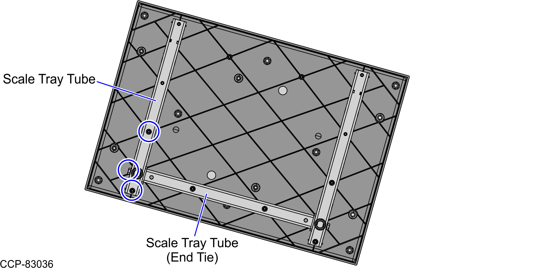 - Attach a Scale Tray Tube at each end of the Scale Tray Tube (End Tie) and secure each tube using three (3) screws, as shown in the image below.