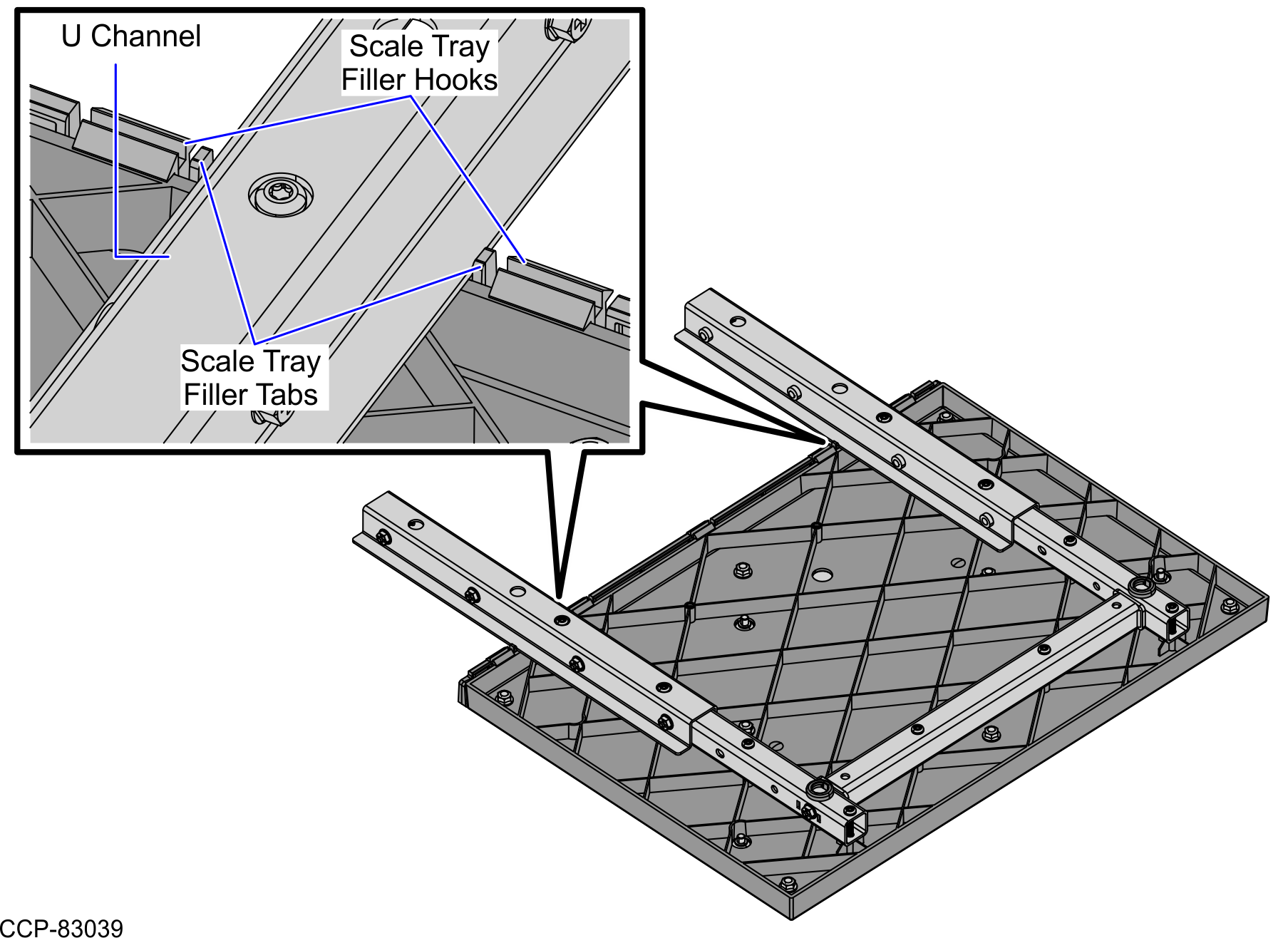 NoteThe Scale Tray Filler tabs should attach to each U Channel and the Scale Tray Filler hooks should attach to the Scale Trays on each side. Refer to the image below for the tabs and hooks.