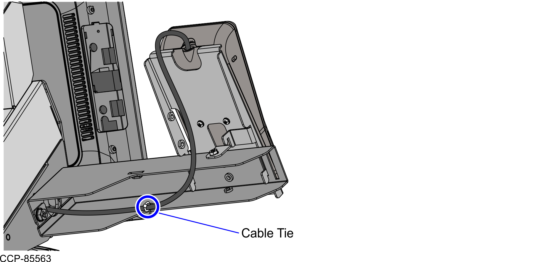 - Route and secure the PIN Pad device cable on the lance bridge at the back of the PIN Pad Arm using a cable tie.