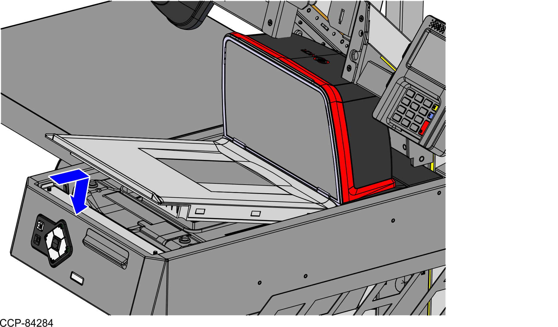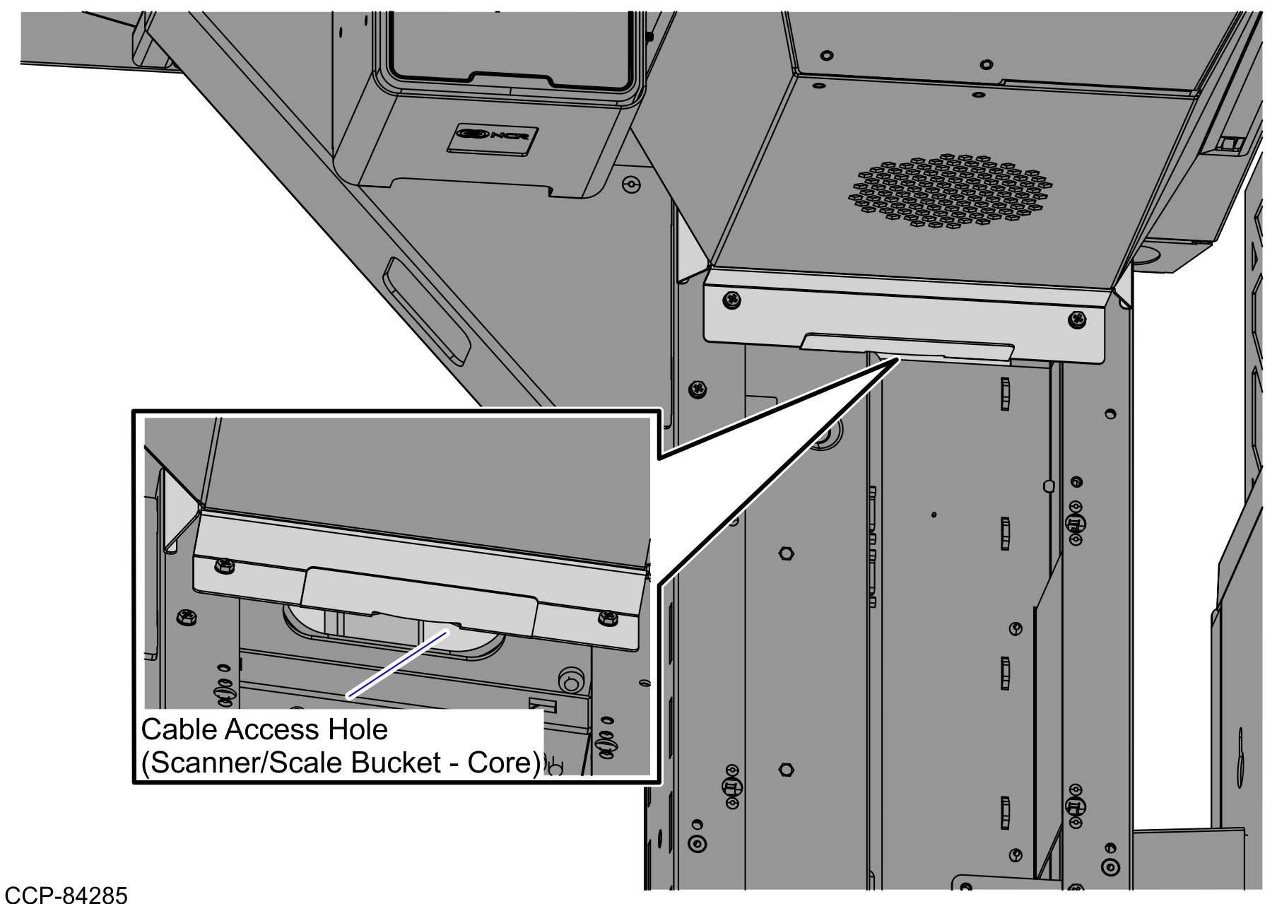 - From the Scanner Bucket, route the cable down through the cable access hole going to the Core (Cabinet), as shown in the image below.