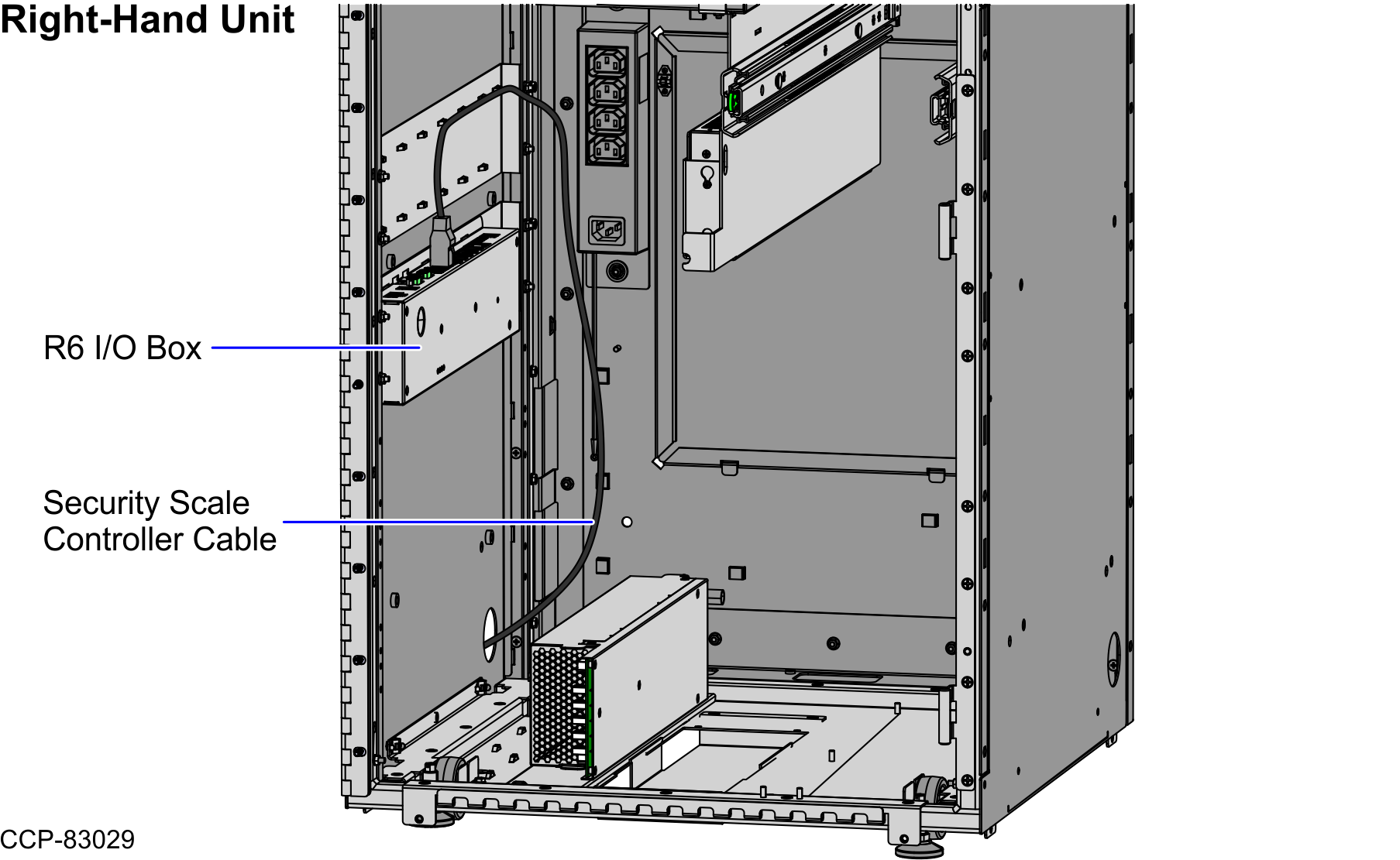 - From the side cable access hole, route the cable along the cabinet wall and connect to the R6 I/O Box (Port G).