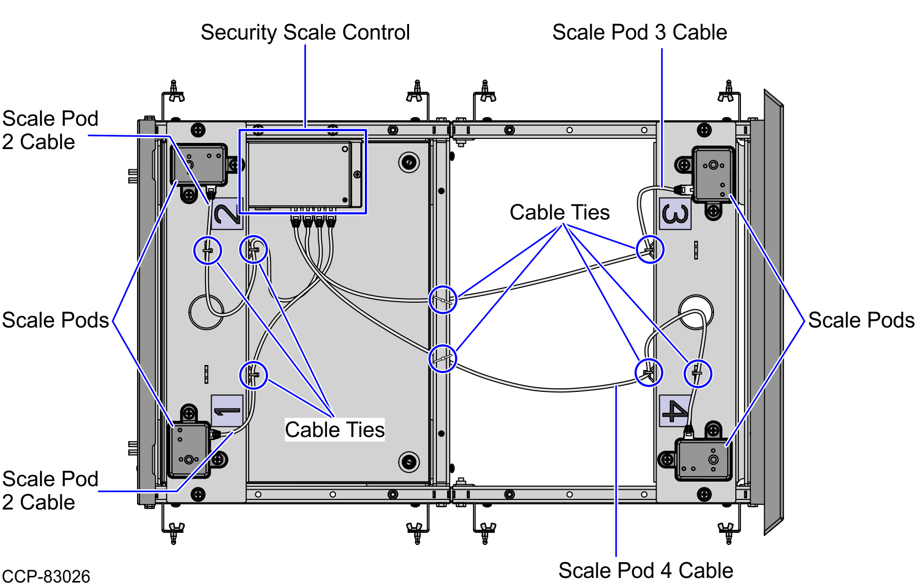 - Attach the cables to the crossbar of the Bagwell Frames and lance bridges on the Scale Pods Bracket using cable ties, as shown in the image below.Note