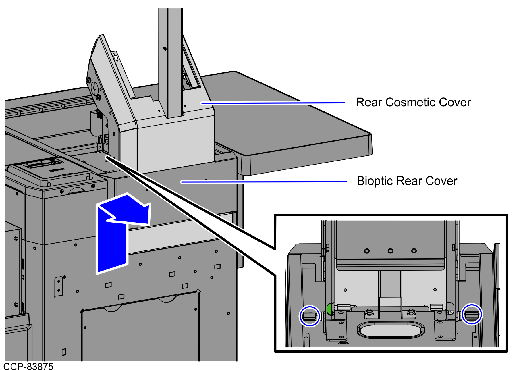 5. Pull up the Rear Cover assembly to disengage the four (4) hooks from the tabs of the Scanner/Scale Bucket, as shown in the image below.