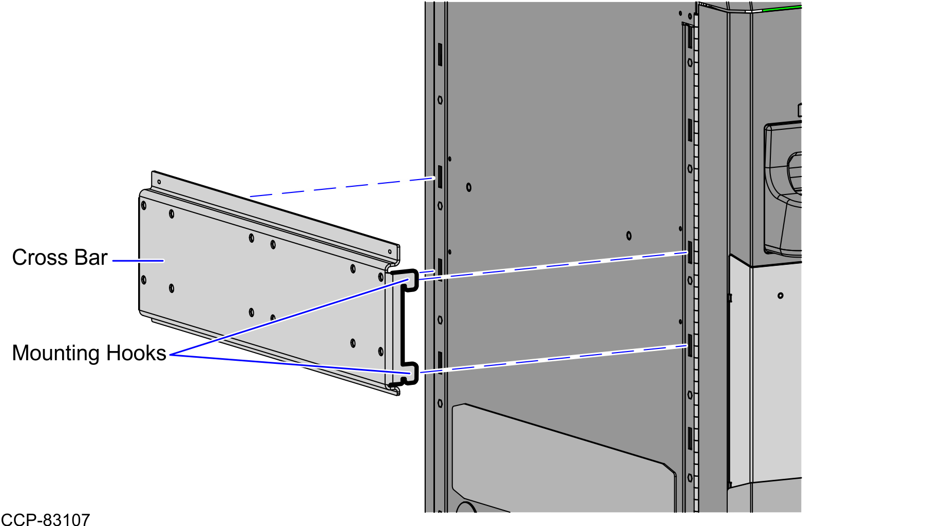 - Based on the preferred Input Shelf height level, slide the mounting hooks of the Cross Bar into the third and forth slotted holes on the side of the Core Cabinet, as shown in the image below.