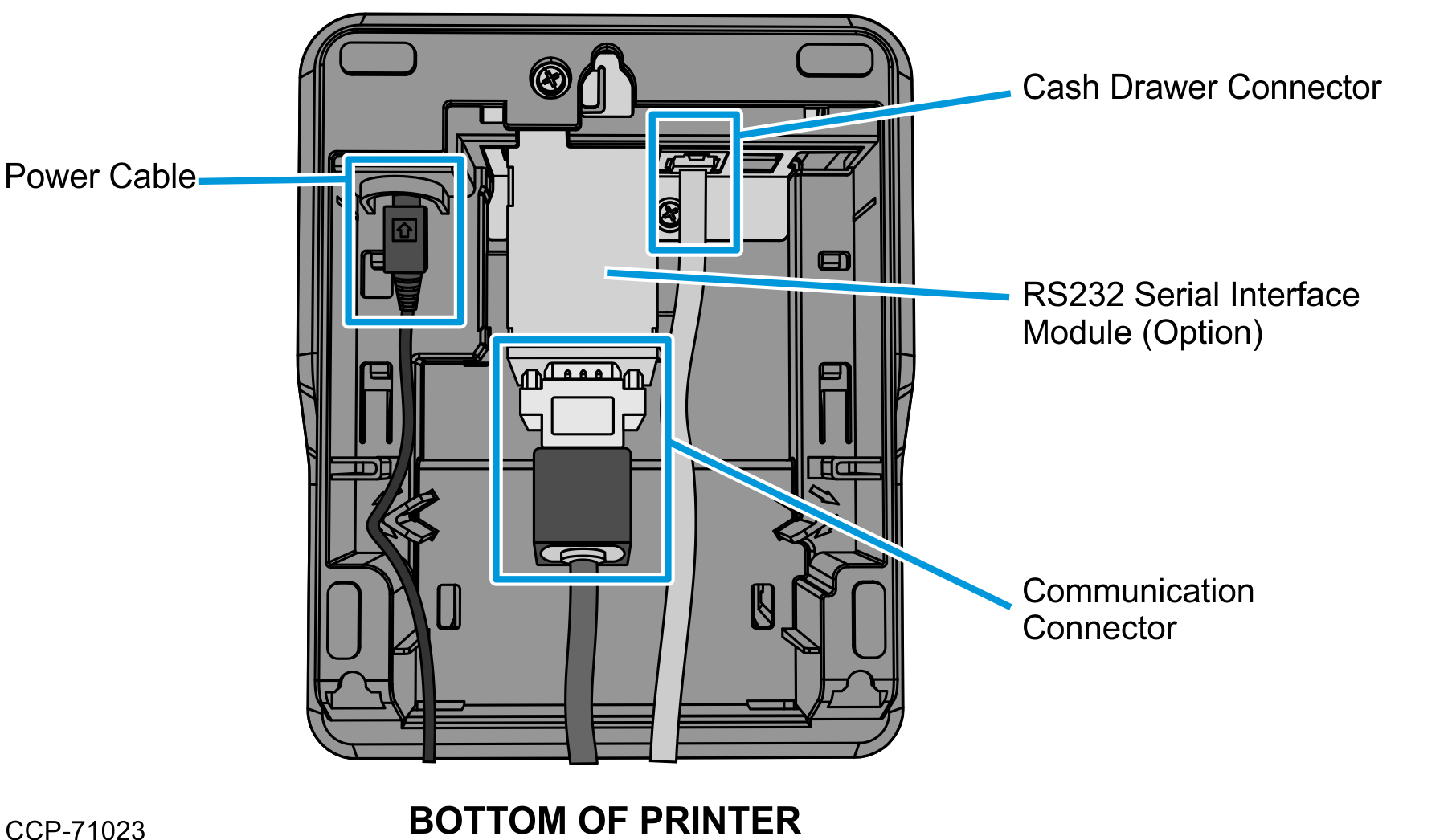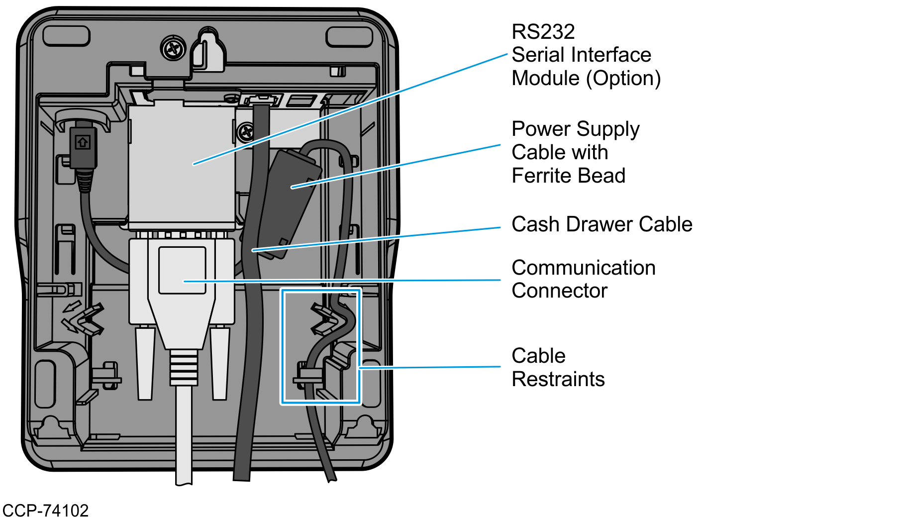 If the power supply cable has a ferrite bead, route the cable under the communication connector and cash drawer cable, and then to the cable restraints. Do the same for the Ethernet Cable Connection.