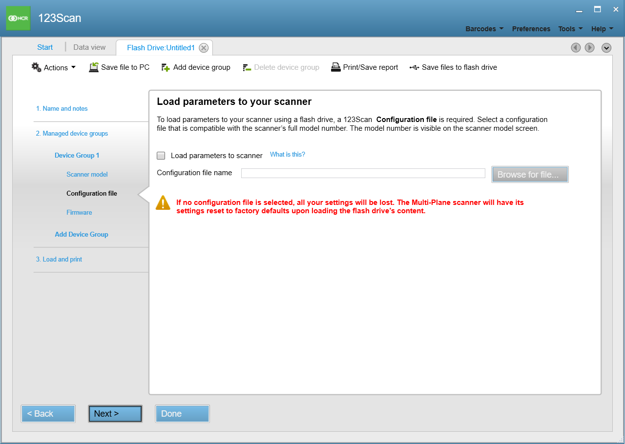 This option enables the USB staging flash drive to load parameters from a 123Scan configuration file to the scanner. If no configuration file is selected, the scanner resets to factory default during staging.