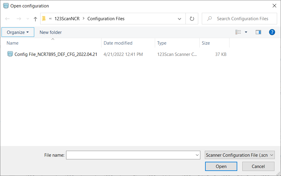 - Browse for the configuration file (.scncfg), and then select Open. The application returns to the load parameters options.
