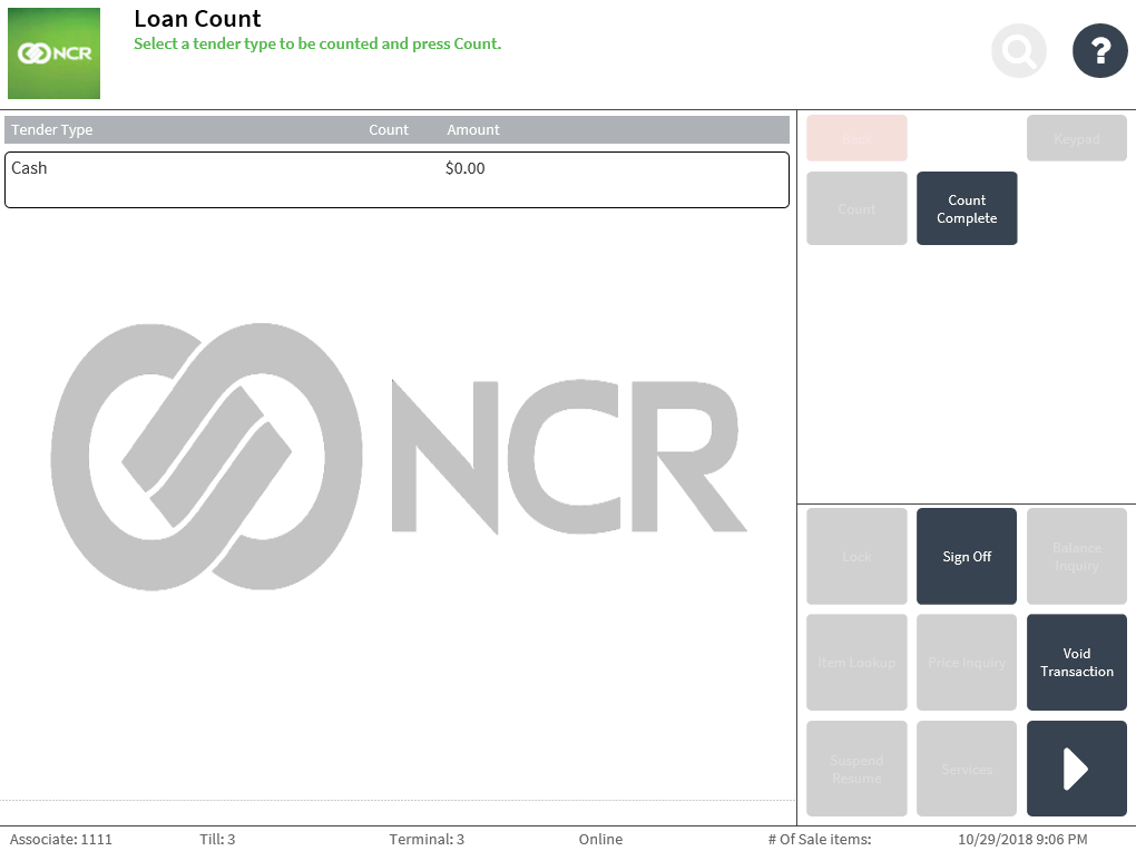 - On the Loan Count screen, select a tender type. In this example, the cash tender type is the only tender configured for the POS. To confirm the selection, the application highlights the selected tender line.