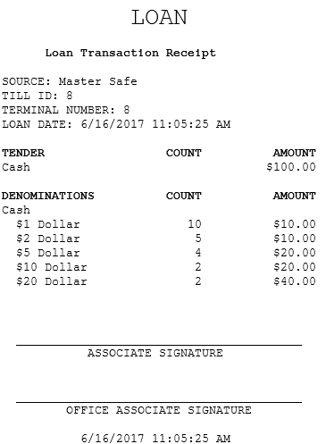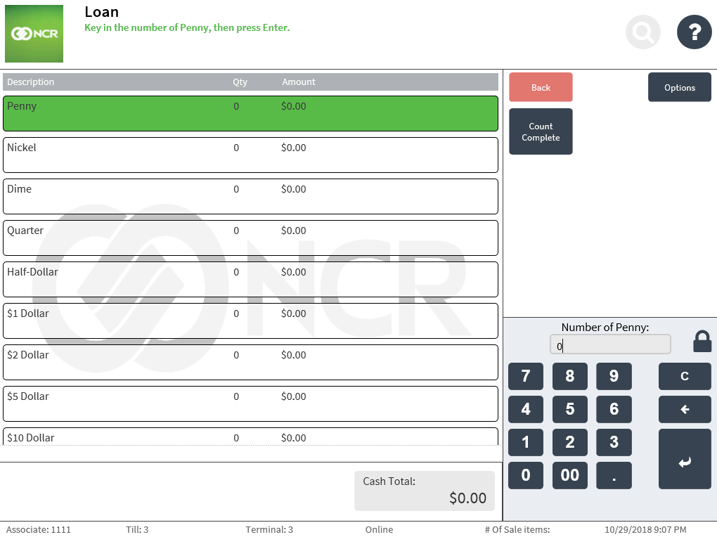 - Select Cash Count to enter the count for specific denominations. The application displays the Loan screen.