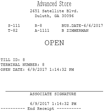 - Close the cash drawer. The application initializes the POS payment solution and then confirms the opening of the terminal by printing an Open receipt. The application displays the Sign On screen.