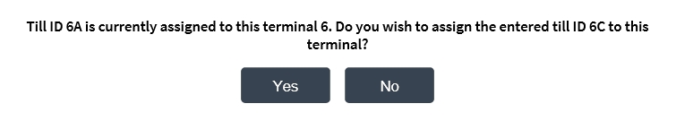 - Select Accept. The application displays a message indicating that the terminal has a different till assigned to it.