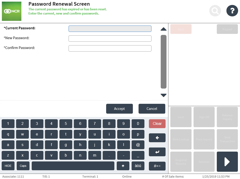 The Change Password feature changes the password of the currently signed on associate. Ensure that the terminal is online and connected to the In-Store Server to use the Change Password function. If the terminal is offline, the POS displays an error message.