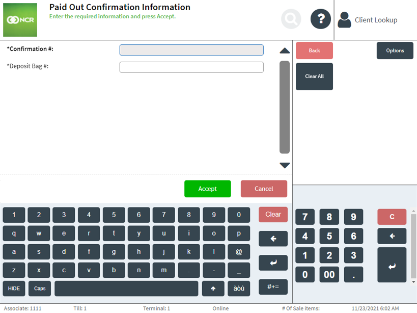 - The application displays the Paid Out Confirmation Information screen. The associate is asked to enter the Confirmation # and Deposit Bag # information.