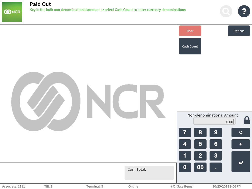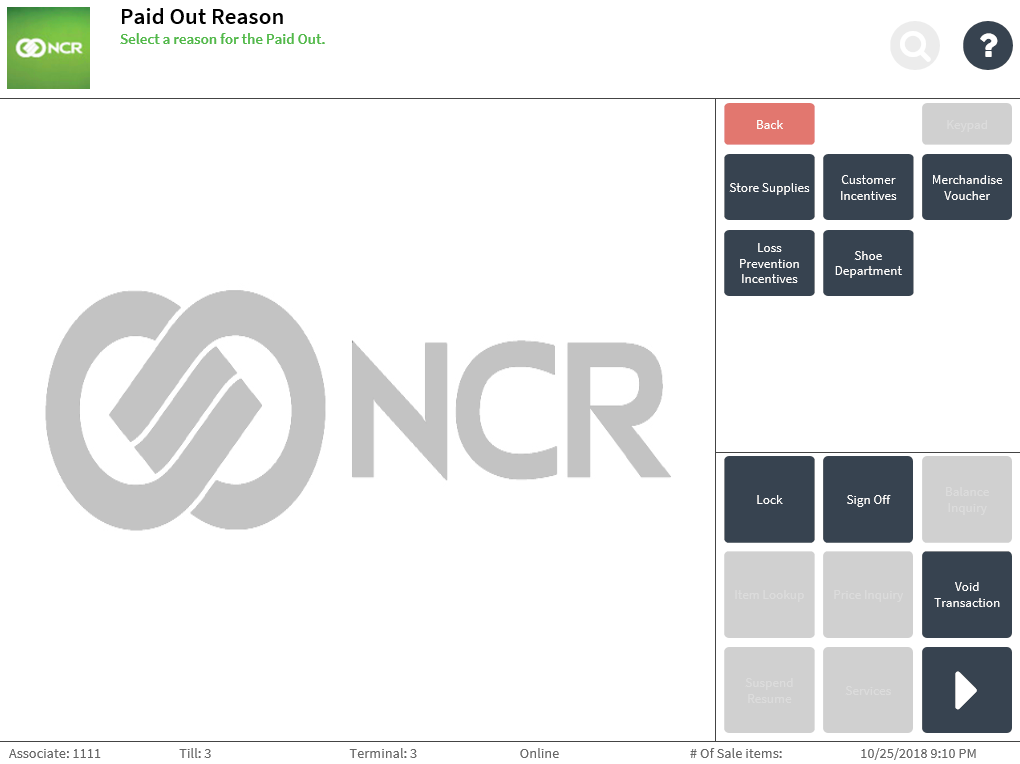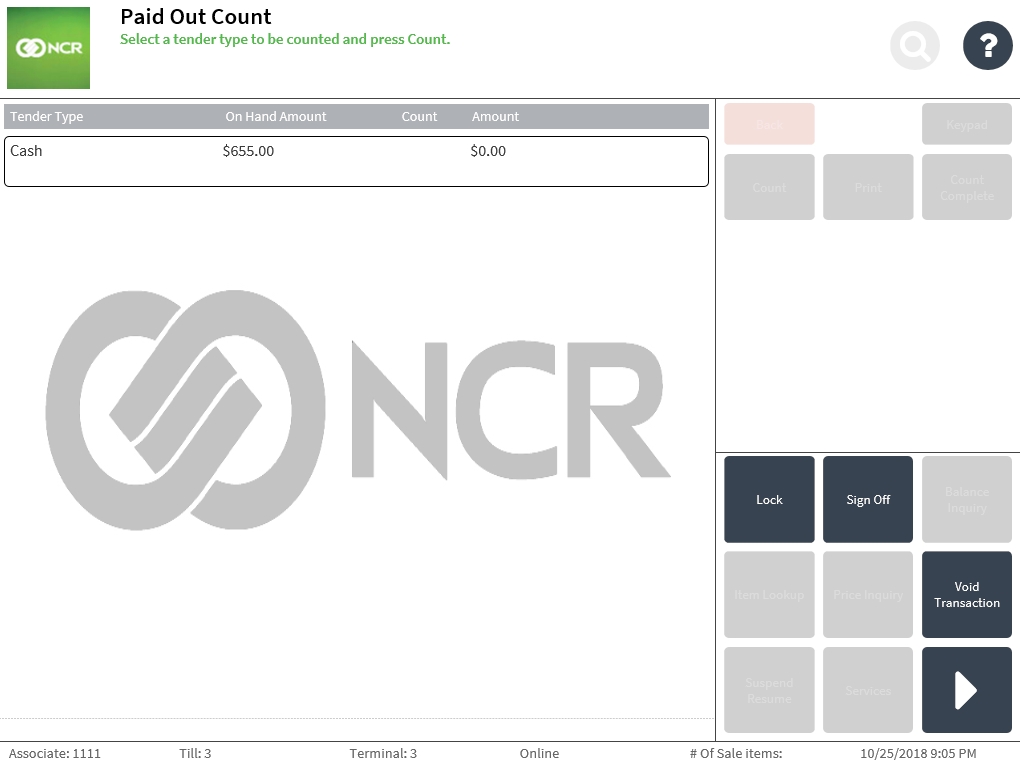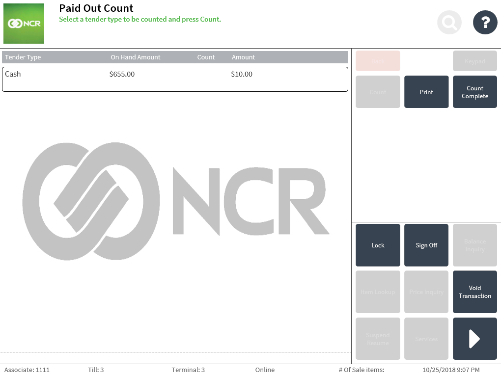 - Select Count Complete. The application displays the Paid Out Reason screen.