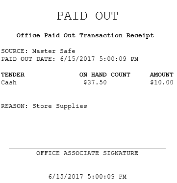 The POS application uses the cash office Paid Out function to pay for store operations miscellaneous transactions. For Paid Out transactions, the POS only pays out cash as the approved tender.