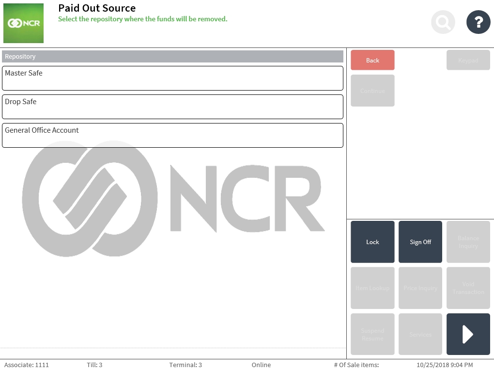 - From the Cash Office Store Totals screen, select Paid Out. The application displays the Paid Out Source screen.