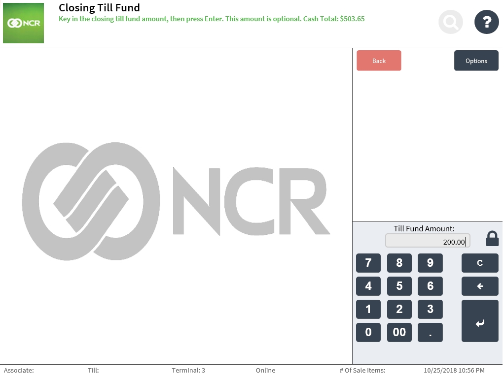 If configured, the application displays the Closing Till Fund screen.