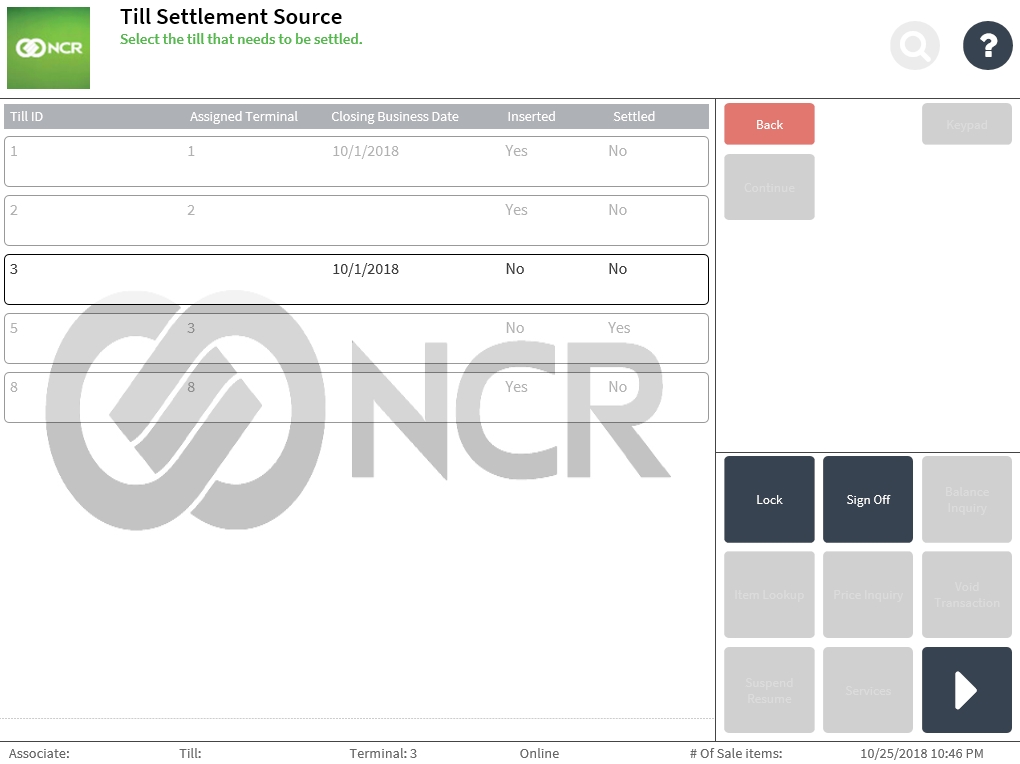 When a till is removed after closing the terminal, the till can be settled in the back office. The till must be removed from the terminal to be settled. Tills that are still inserted in the terminal and tills that are already settled are grayed out on the application screen and cannot be selected during the till settlement.