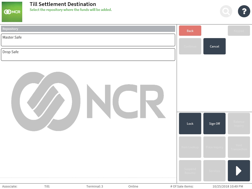 - Select Continue. The application displays the Till Settlement Destination screen.