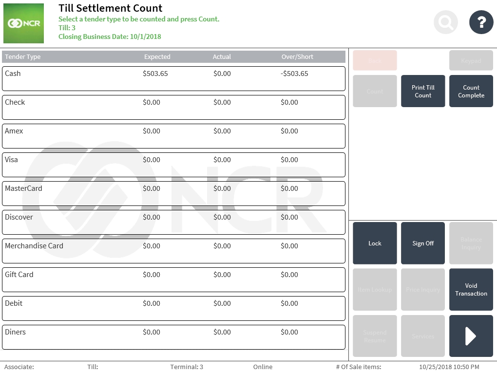 - Select Count Complete. The application completes the till settlement transaction and prints the transaction receipt.