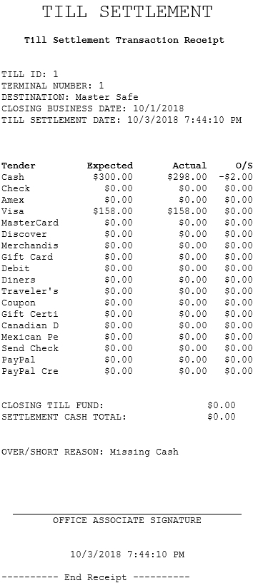 Till Settlement transaction receipt