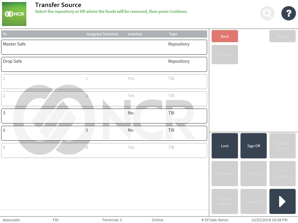 - From the Cash Office Store Totals screen, select Transfer. The application displays the Transfer Source screen.