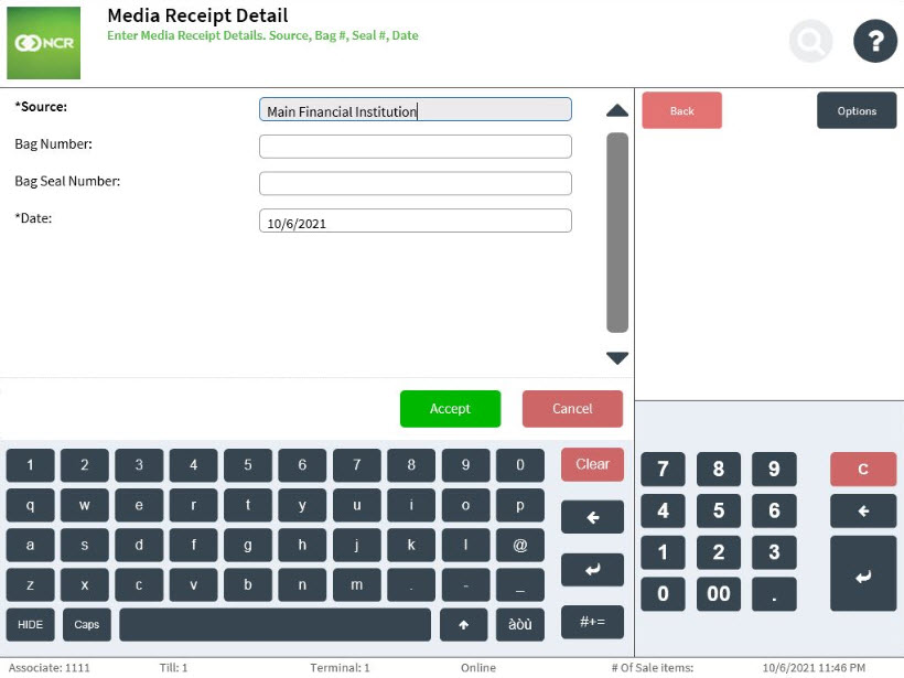 Field Name Description Source Displays the configured default financial source. Bag Number Specifies the 8-digit identification number of the money bag. Bag Seal Number Specifies the 8-digit bank seal number for the money bag. Date Displays the current business date by default. - Select Accept. The application displays the Media Receipt Count screen.