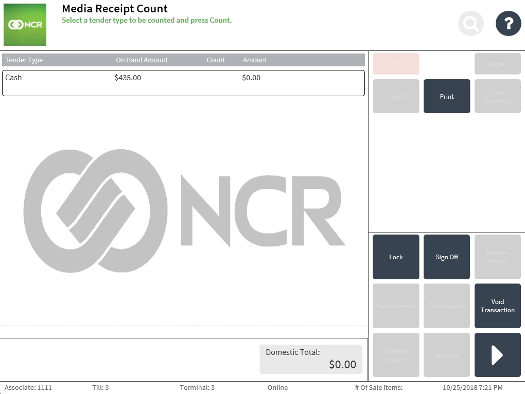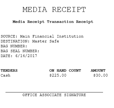 - Select a tender type and select Count. The application displays the Media Receipt screen.