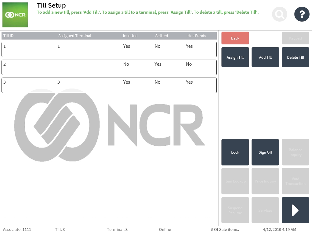 - From the Cash Office Store Totals screen, select Till Setup. The application displays the Till Setup screen.