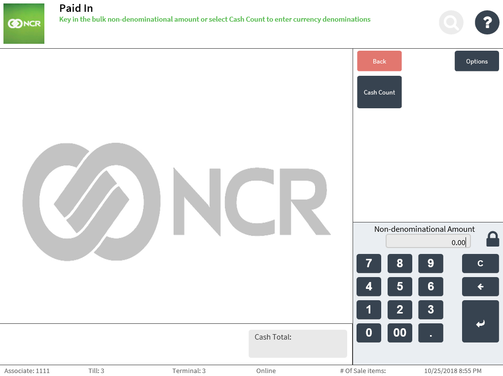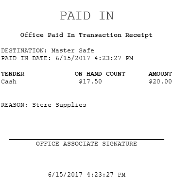 The POS application uses the cash office Paid In function to process non-sale transactions at the POS terminal. For Paid In transactions, the POS only accepts cash as the approved tender.