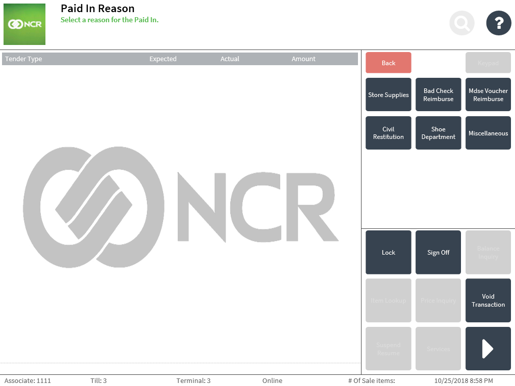 - Select Count Complete. The application displays the Paid In Reason screen.