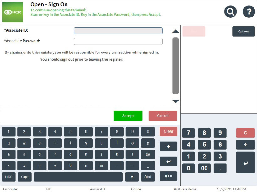 NoteIf the store is closed, a message is displayed indicating that the terminal cannot be opened. To open the terminal when the store is closed, select Override on the system message, and enter the authorized user’s ID and password.