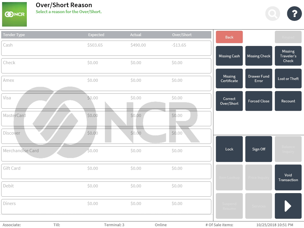 When there is an overage or shortage during till settlement, the application displays the Over/Short Reason screen before completing the transaction.