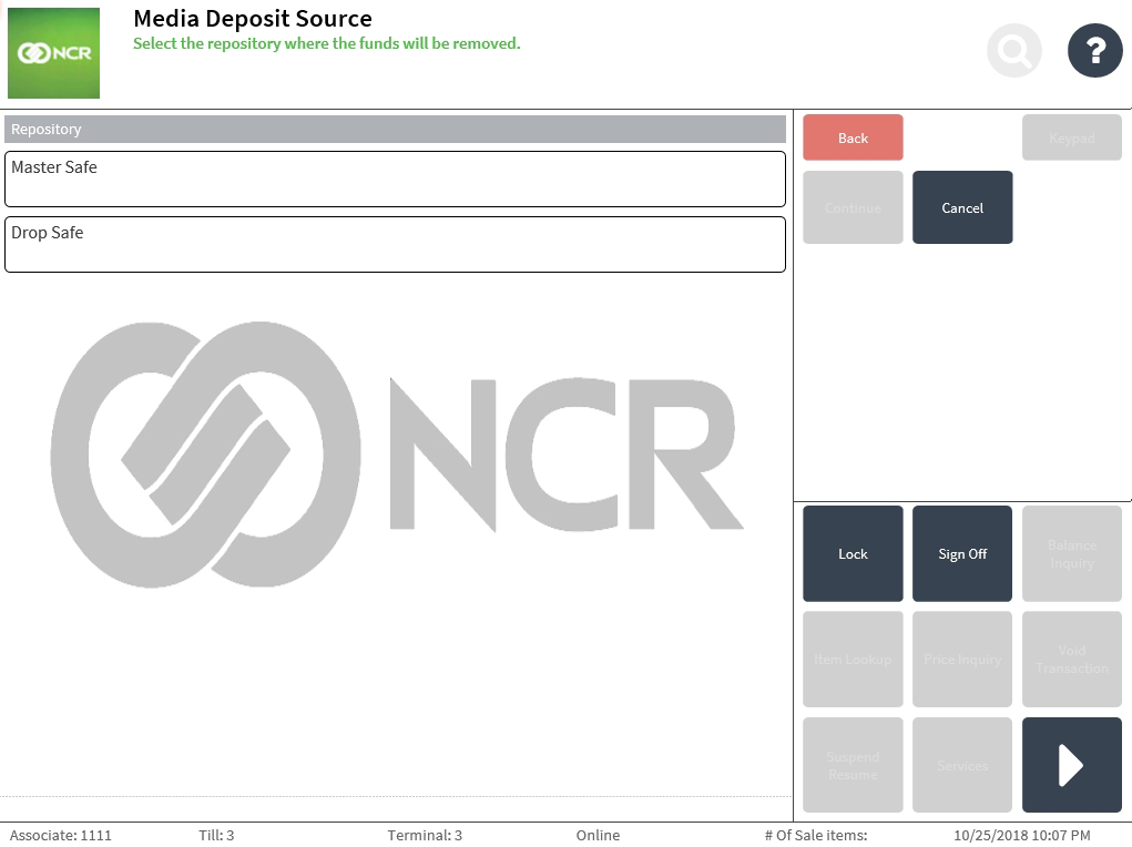 - On the Cash Office Store Totals screen, select Media Deposit. The application displays the Media Deposit Source screen.