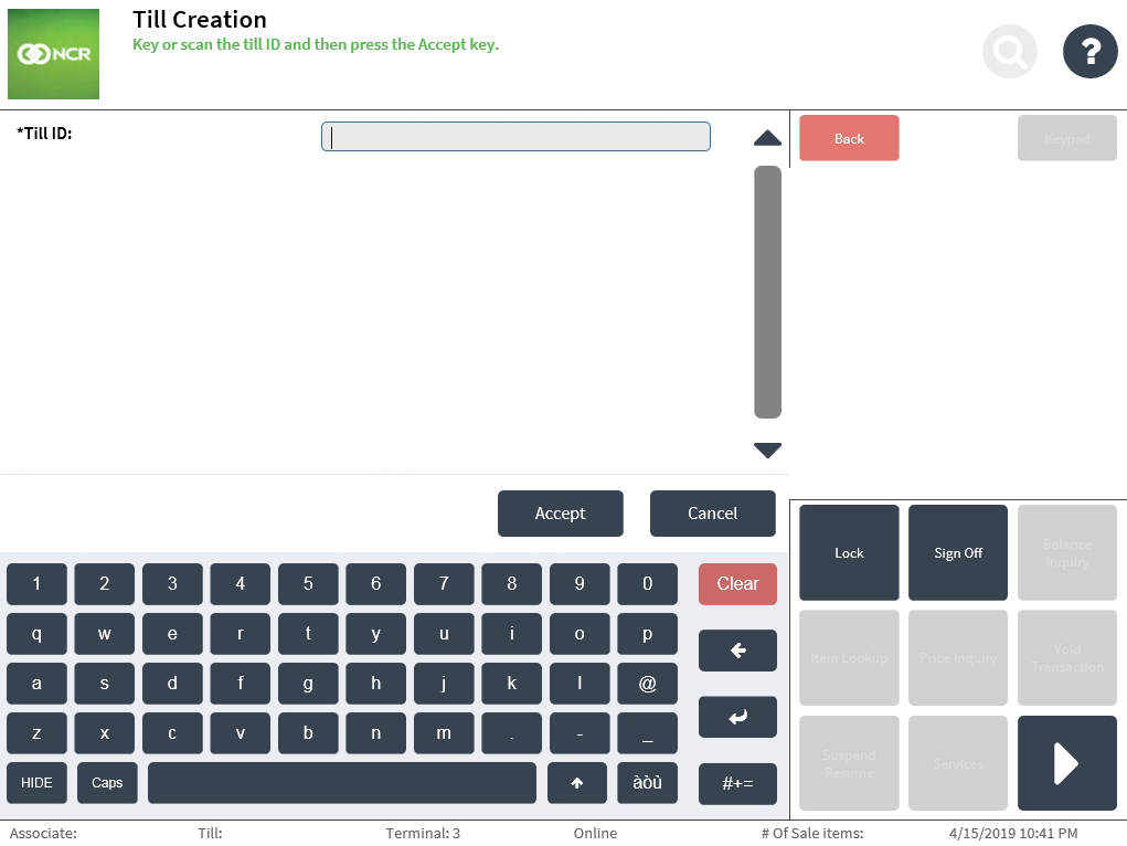 - On the Till Setup screen, select Add Till. The application displays the Till Creation screen.