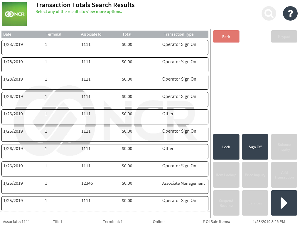 - Scroll through the screen to view the transaction search results by totals.