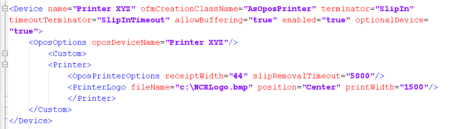 ImportantThe POS application can only support one printer at a time. Simultaneously enabling two or more printer device tags in the file can cause the printer integrated to the POS terminal to malfunction or be unresponsive.
