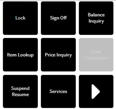 Select a global button to access each function. To view the buttons that are not immediately visible, either select the right-arrow button or, if using a touch screen, swipe the global button ribbon to the left or right. The POS application can be configured to hide, display, and rearrange the global buttons. For more information, refer to Display or rearrange Global Buttons.
