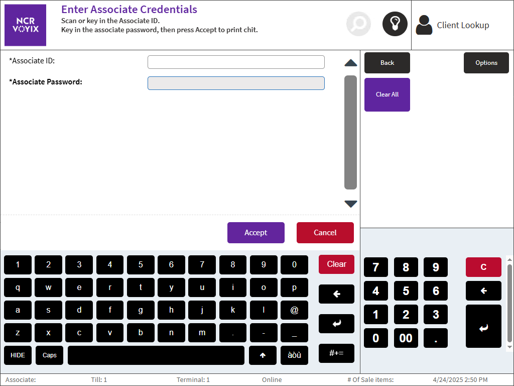 - Select Print Associate QR. The POS application displays the Enter Associate Credentials screen.